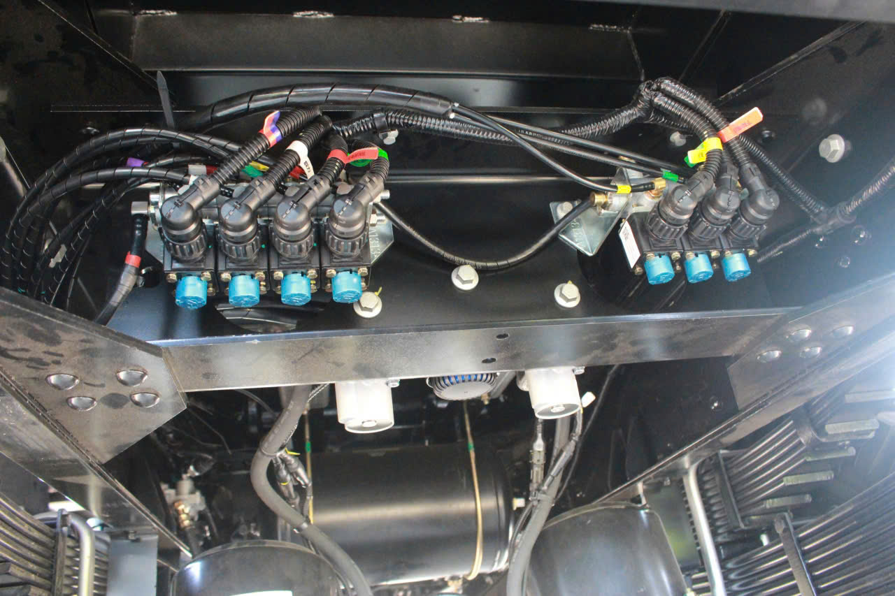 Hệ thống treo trước và sau của xe đều là nhíp lá 2 tầng mang lại độ êm ái và ổn định khi di chuyển trên nhiều loại mặt đường. Thiết kế này giúp xe chịu tải tốt hơn, đồng thời giảm hao mòn lốp và tiết kiệm nhiên liệu. Xe còn được trang bị hệ thống khí nén, giúp quá trình phanh nhanh, nhạy và an toàn ngay cả khi xe đang chở nặng hoặc di chuyển trên dốc. Ngoài ra, hệ thống lốp xe đồng bộ trước/sau có kích thước lớn, bám đường tốt, hỗ trợ xe vận hành ổn định trong mọi điều kiện.